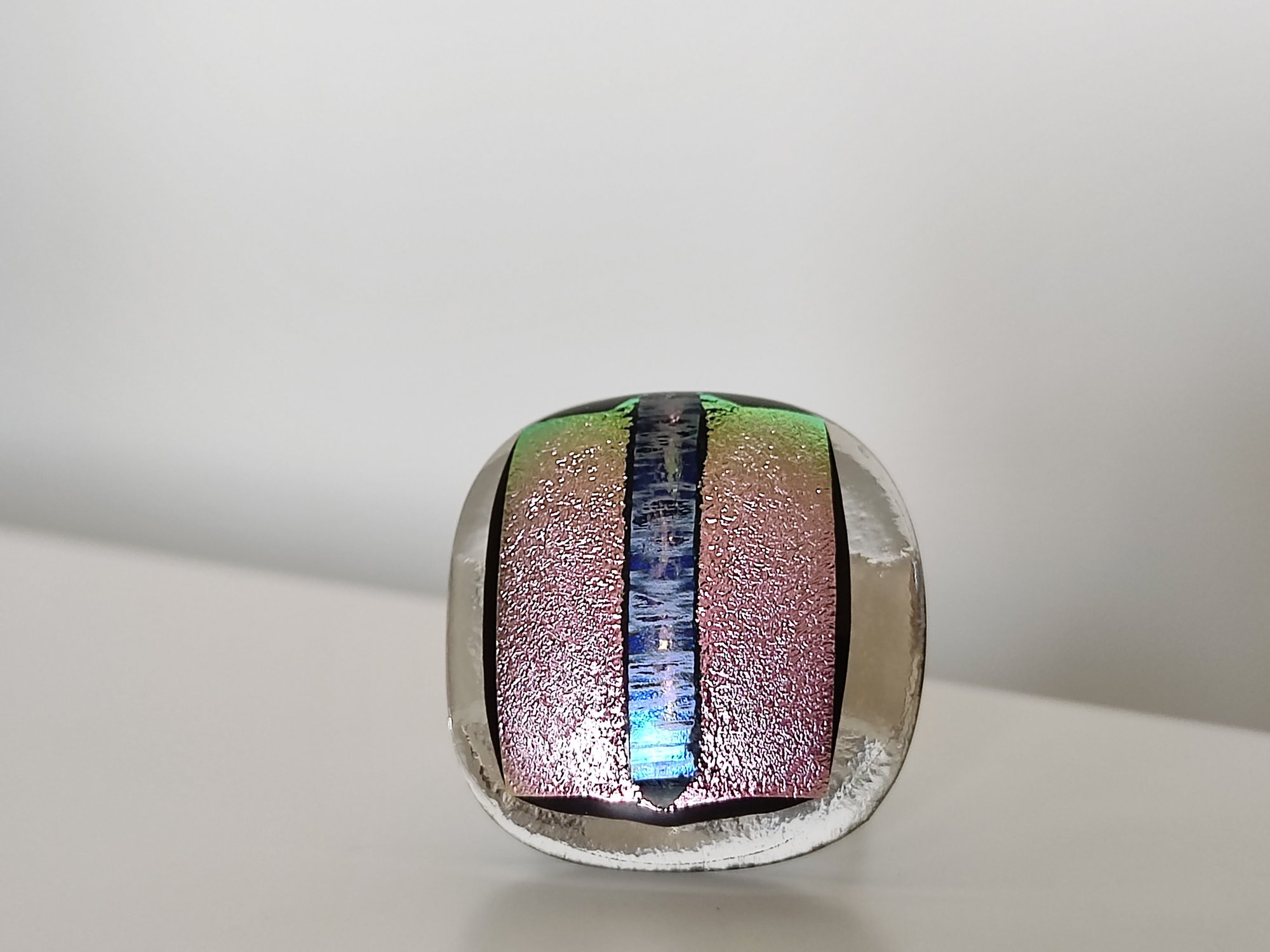 Anillo de vidrio rosa. Con base transparente. El vidrio es dicroico. Está hecho a mano, fundido en horno, por lo que es una pieza única. Base ajustable de latón. Sin plomo, ni cadmio, ni níquel.